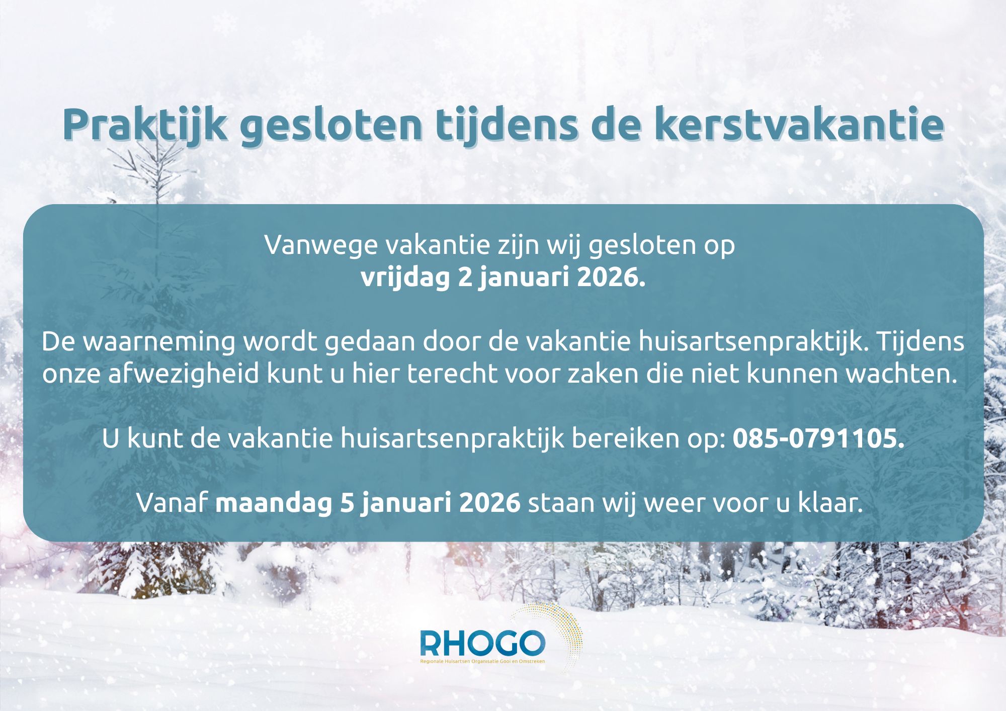 Op vrijdag 2 januari 2026 is de praktijk gesloten. Voor zaken die niet kunnen wachten tot maandag 5 januari 2026 kunt u terecht bij de vakantie huisartsenpraktijk. U kunt de vakantie huisartsenpraktijk bereiken op: 085-0791105.